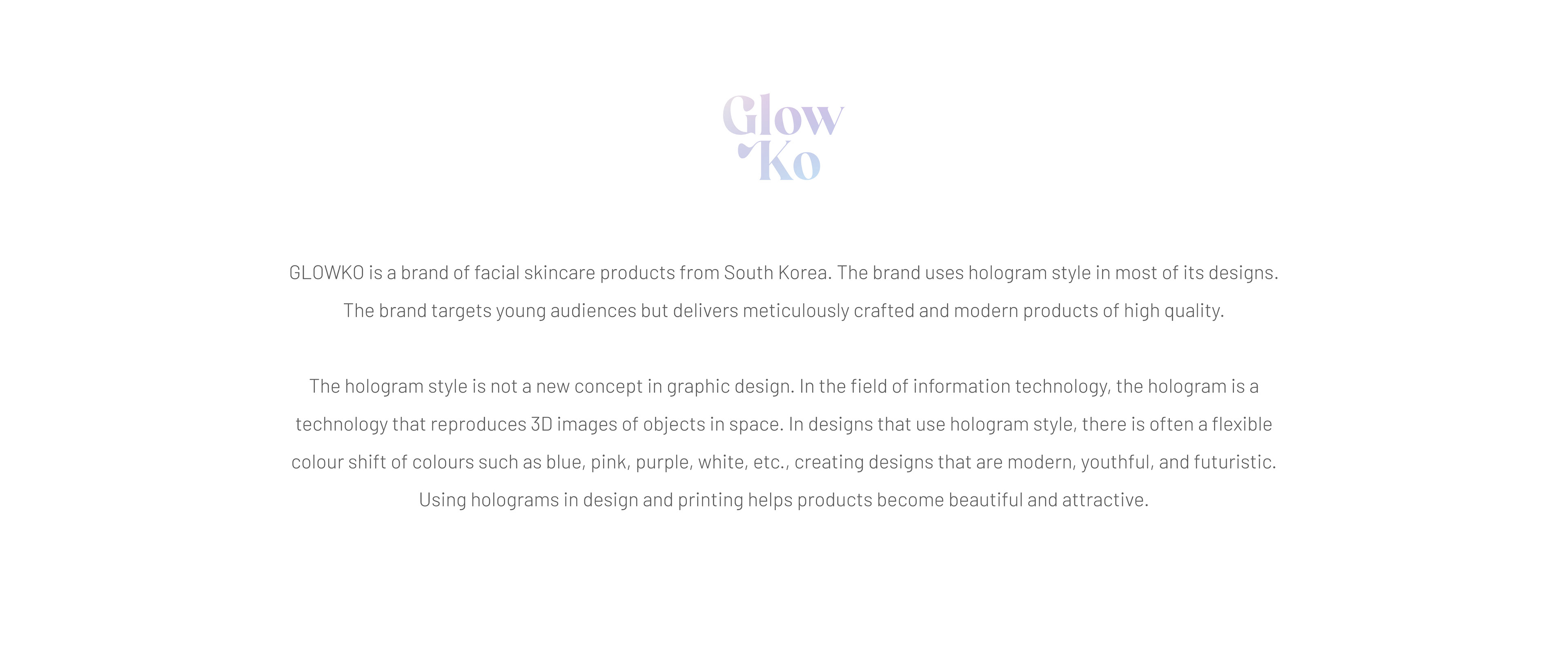 GLOWKO is a brand of facial skincare products from South Korea. The brand uses hologram style in most of its designs. The brand targets young audiences but delivers meticulously crafted and modern products of high quality.