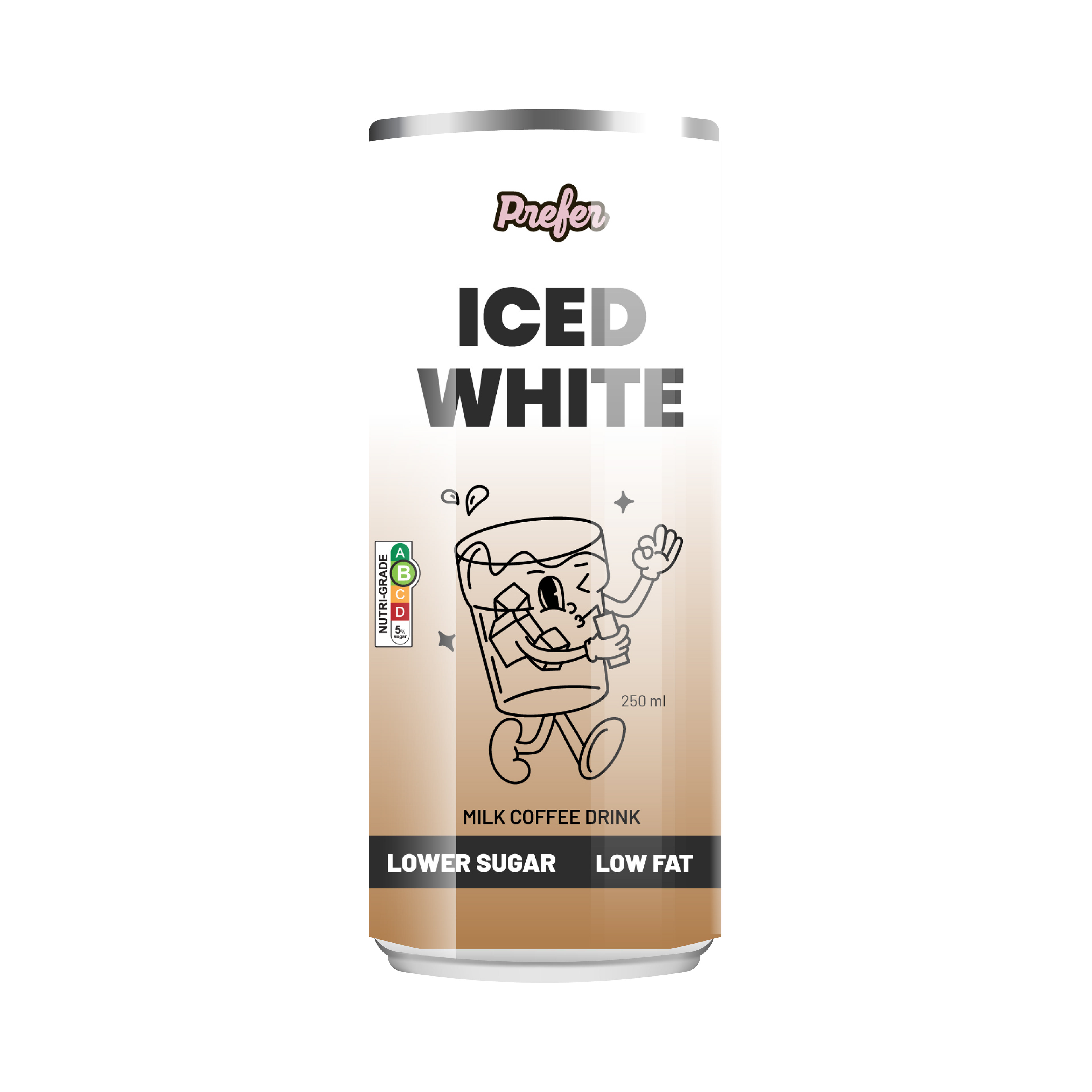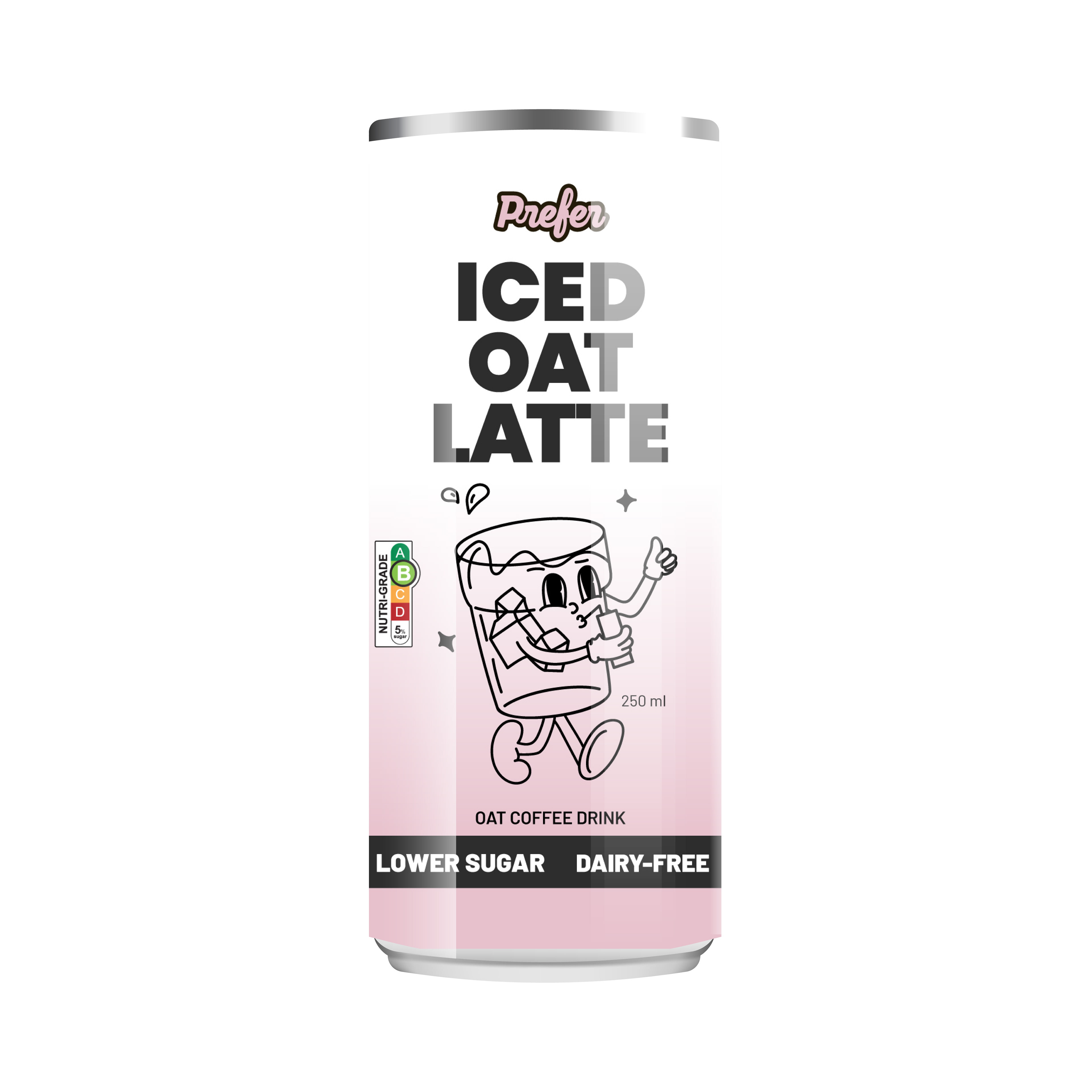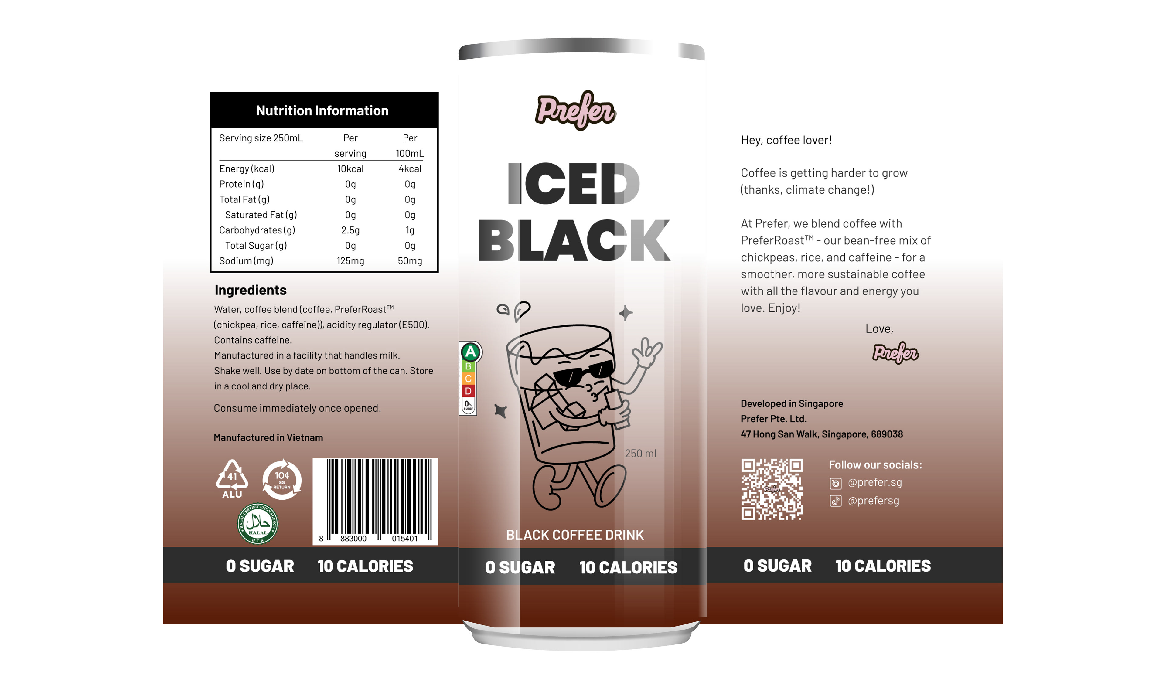 The concept centers around a playful illustrated character — a joyful glass of coffee — interacting affectionately with the product. This character not only adds personality and approachability but also symbolizes Prefer’s mission: crafting a lovable, sustainable coffee alternative through their bean-free PreferRoast™ blend.